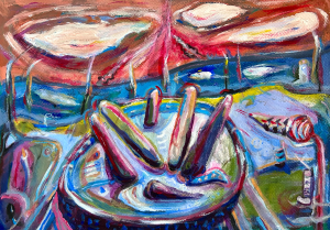 Storm pushes a boat towards kingdom come. 2024. Acrylic on paper. 50x55cm. ( $700. Framed)