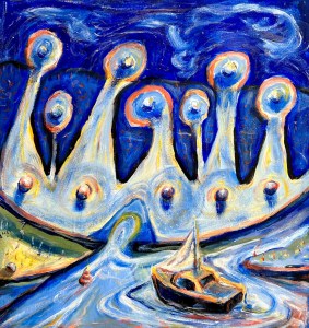 Storm pushes a boat towards kingdom come. 2024. Acrylic on paper. 50x55cm. ( $700. Framed)
