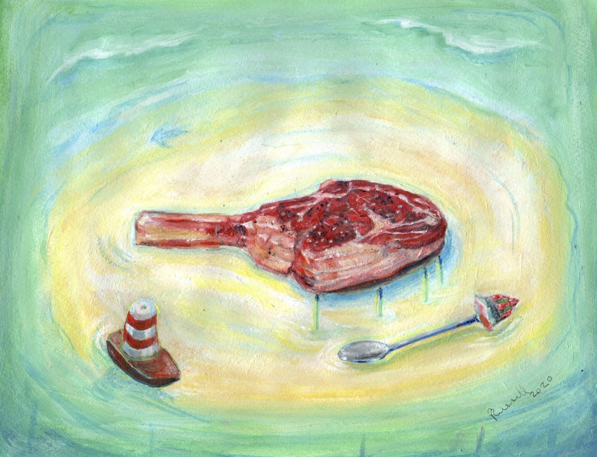 Peter found the largest steak so I painted it. I was thinking about being lost on our tropical islands (exotic imaginations) we bring what we think is useful but after a while there is nothing that we can do with what we chose to bring. May be we were in too much of a rush all the time.